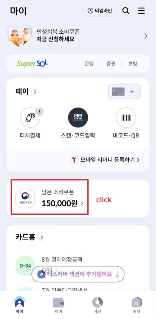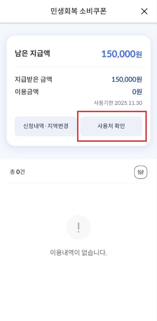 👉’남은 소비쿠폰’ 클릭: 로그인 후 ‘남은 소비쿠폰’을 클릭합니다. (쿠폰이 충전되어 있지 않더라도 사용처 조회는 가능.)