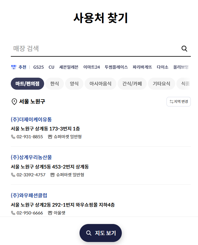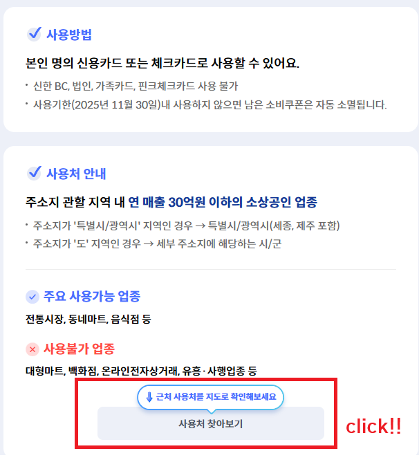 👉’사용처 찾아보기’ 버튼 확인: 위 주소로 접속 후 마우스 스크롤을 아래로 내리면 ‘사용처 찾아보기’ 버튼이 나옵니다.