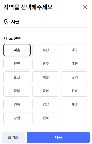 👉거주지 지역 선택: 주민등록상 거주지 지역을 선택한 후 ‘다음’ 버튼을 클릭합니다.