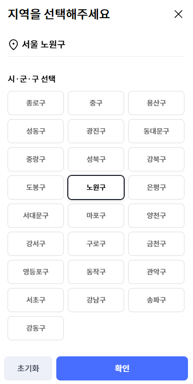 👉시·군·구 지역 선택: 주민등록상 시·군·구 지역을 선택한 후 ‘확인’ 버튼을 클릭합니다.